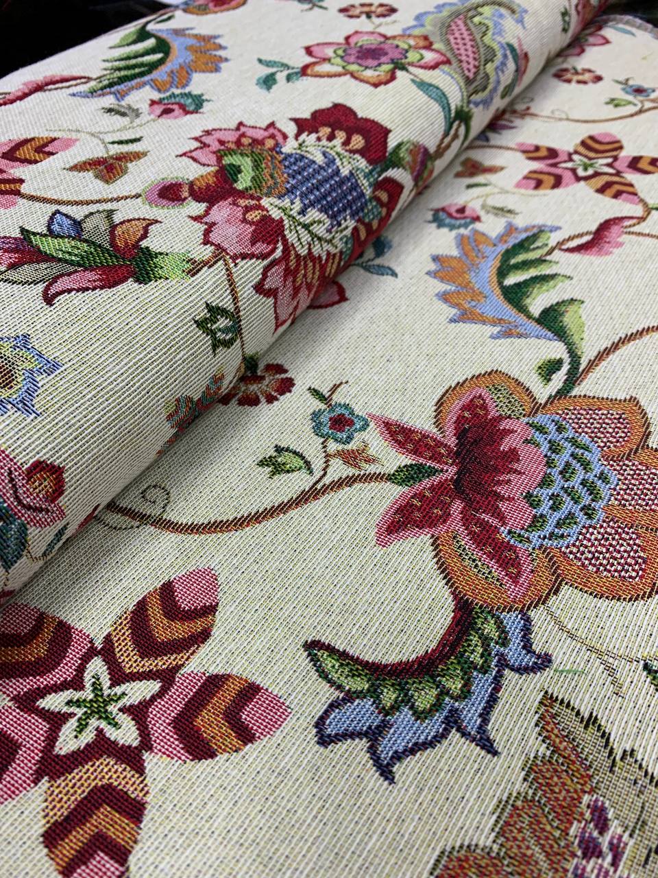 Високоякісна гобеленова тканина з квітковим малюнком. Вироблено в Іспанії. Таку тканину можна використати для виготовлення подушки, скатертини, верхнього одягу чи іншого декору. Ширина тканини 140 см.