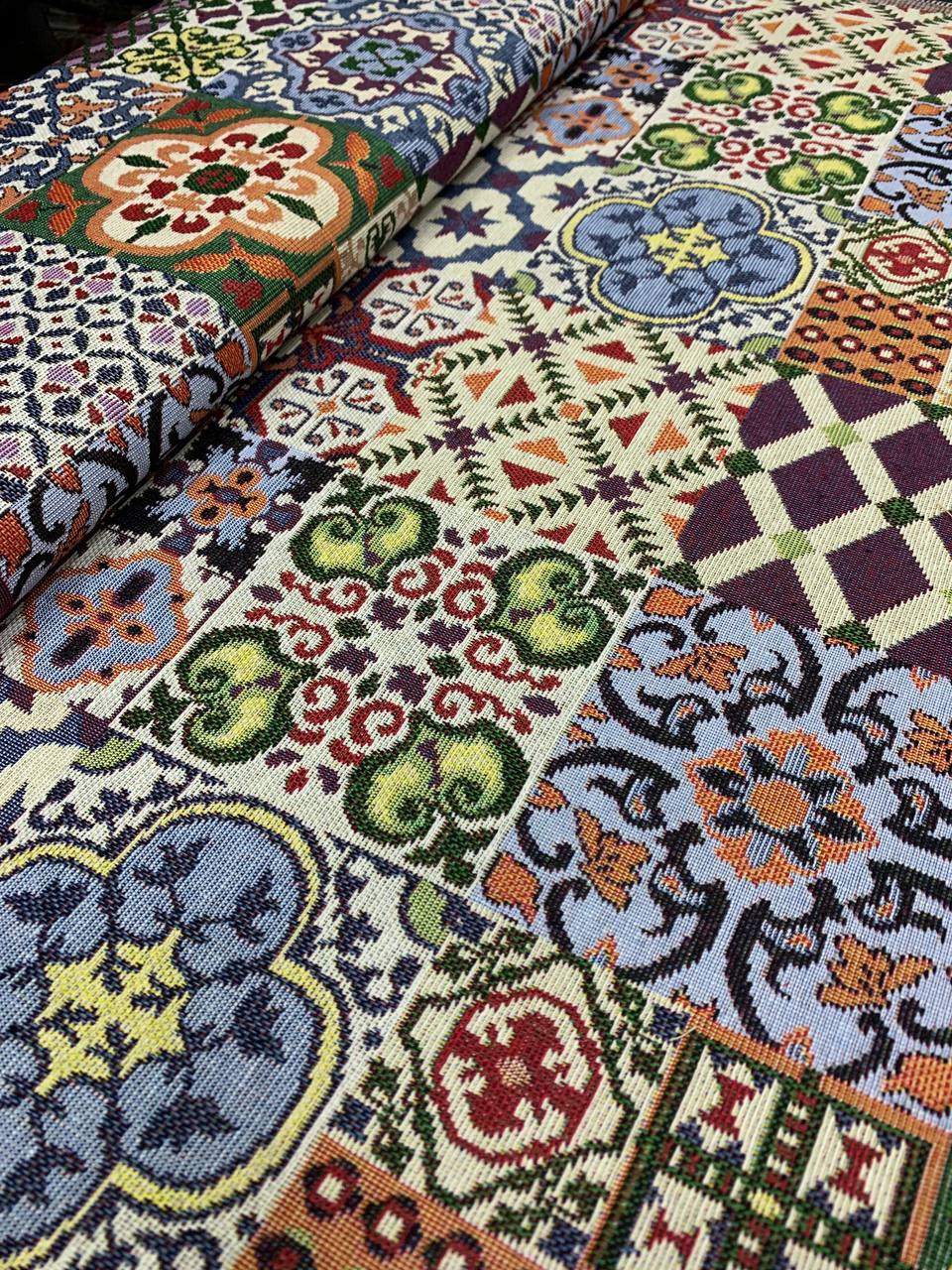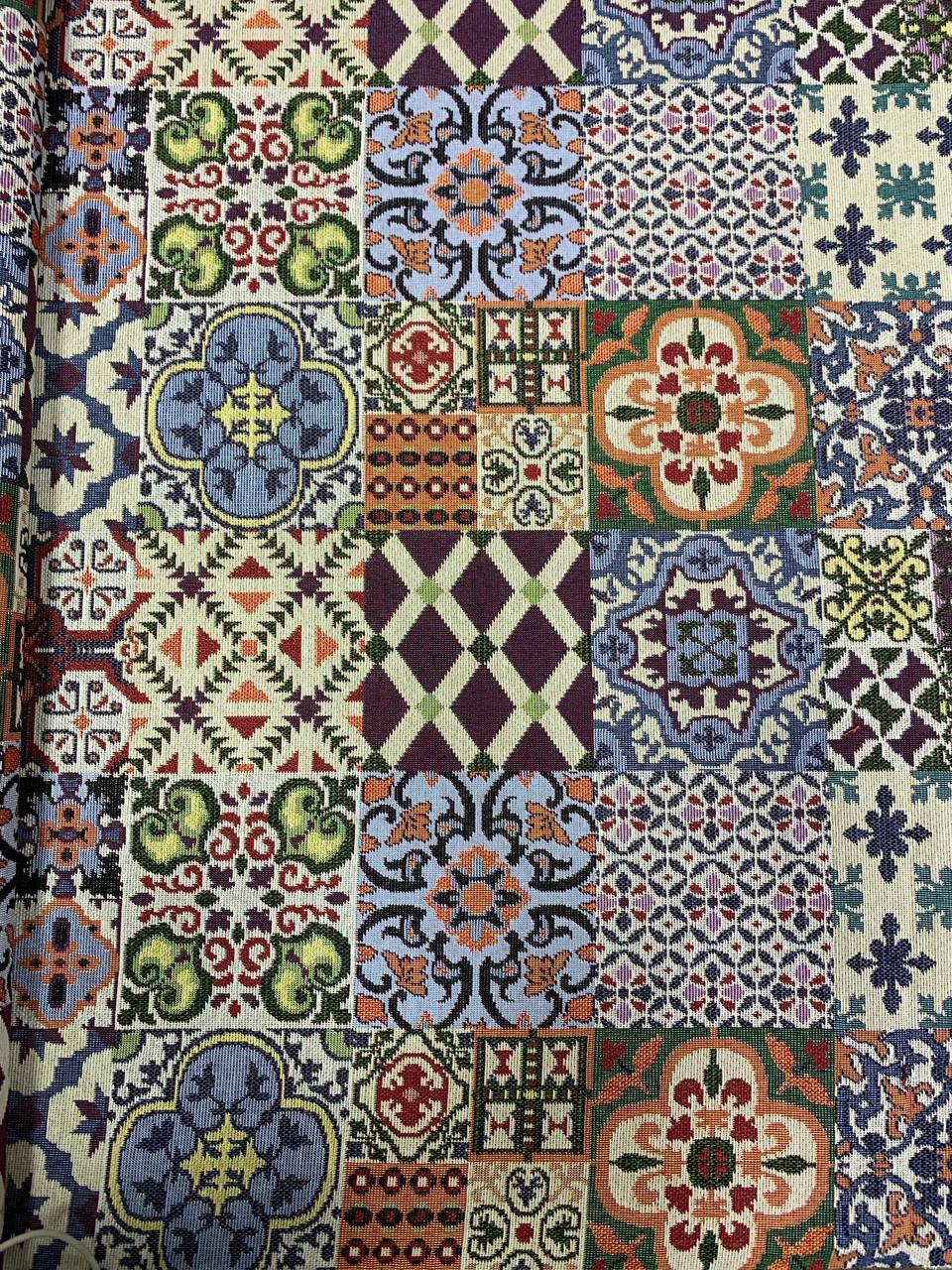 Високоякісна гобеленова тканина з геометричним малюнком. Вироблено в Іспанії. Таку тканину можна використати для виготовлення подушки, скатертини, верхнього одягу чи іншого декору. Ширина тканини 140 см.