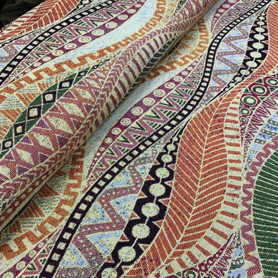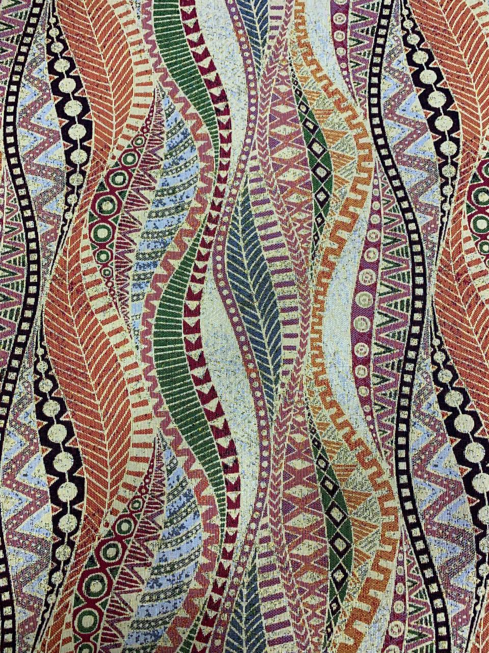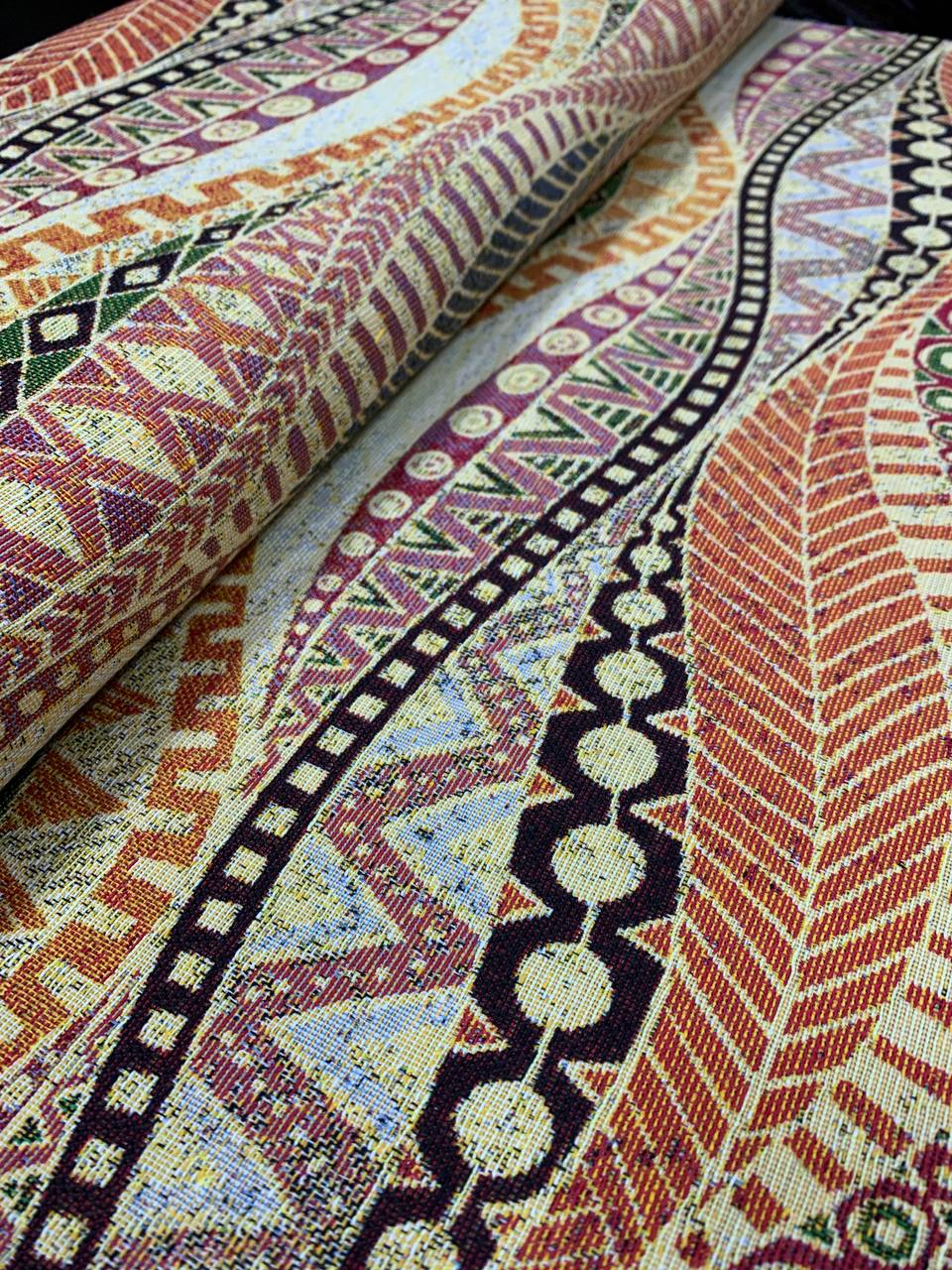 Високоякісна гобеленова тканина з геометричним малюнком. Вироблено в Іспанії. Таку тканину можна використати для виготовлення подушки, скатертини, верхнього одягу чи іншого декору. Ширина тканини 280 см.