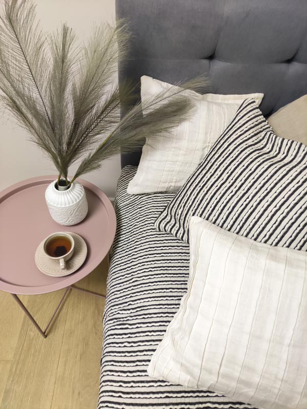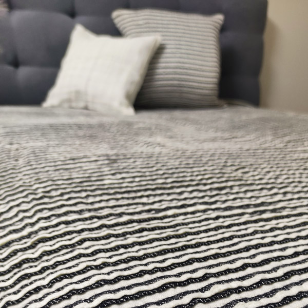 Декоративне лляне покривало. 3D-тканина в чорно-білу смужку.