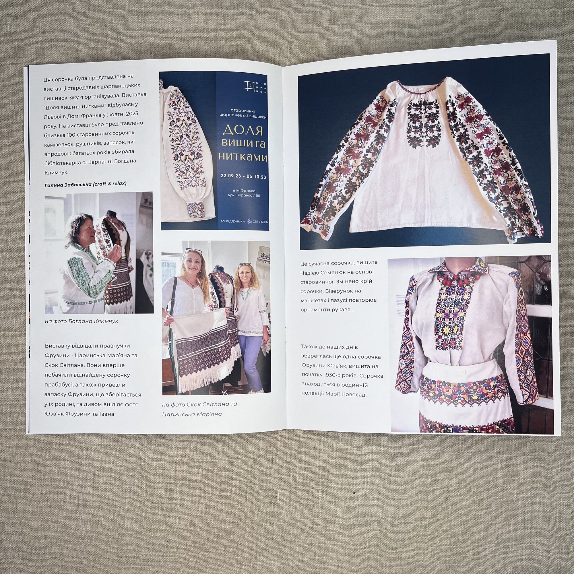 Ця схема втілена з ідеї старовинної шарпанецької сорочки, вишитої на початку 1930-х років, та вражає своєю особливою енергетикою. Кожен вишитий мотив переносить нас у часи минулого, але водночас зберігає в собі свіжість та витонченість. Ця сорочка – не лише твір мистецтва, але історія жінки, родини, і власне, історія України.
