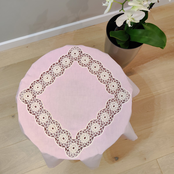 Скатертина лляна рожева з молочним мереживом створеним вручну